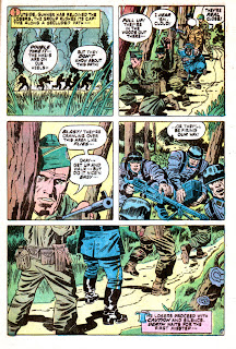 The story, written by Jack Kirby, as students of Kirby's work will know, lacks that dimension Stan Lee gave to their collaborations. Nevertheless, this one is quite readable compared to some of his Fourth World material, which gets so convoluted that it often ceases to make sense. This tale is straightforward, and makes a simple point. Along the way we've seen the Nazi assumption of racial superiority again exposed. Although little was made of it at the beginning of the story, the American truck that had been blown up was manned by an African American segregated supply unit, by the looks of it, again bringing into the picture the paradox of segregated America fighting to defeat Nazi racists in an anti-racist war.